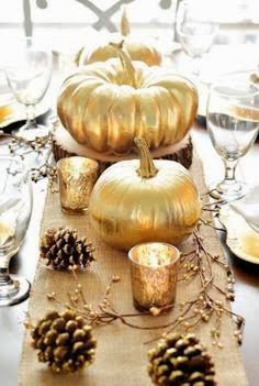 The gold pine cones and some sprigs bring a little fall outdoors to your table